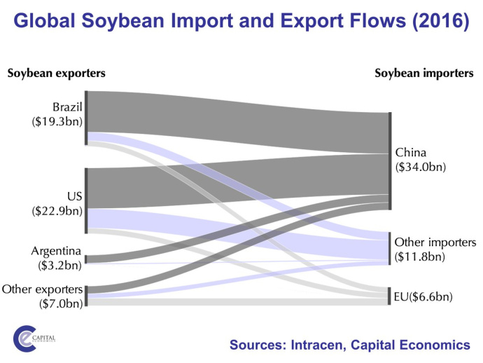 中国对大豆需求的减少会影响到美国,但是美国竞争优势超过南美。重新平衡大家依然会青睐美国生产的大豆,南美可以扩大生产,产能增加对价格压力产生出来,但是资源禀赋摆在这里,这样的扩种也会受到一些限制。中国进口大豆的时候,豆粕关系动物养殖,那么动物养殖的规模是不是满负荷了,中国也会反省自己的大豆产业相关的比如饲料行业、养殖行业、压榨行业所有产业结构。贸易战会加速这种产业调整。