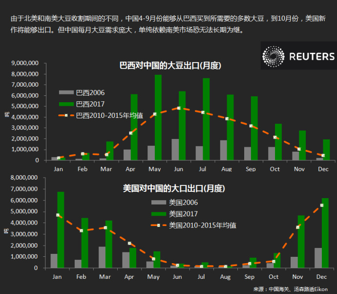 上一年度美国大豆的对华出口比去年减少了22%,去年是比较超常的年份。这主要还是市场的原因。巴西货币走弱贬值,同时去年有2500多万吨的大量库存。巴西大量廉价的大豆销往中国,美国的市场让巴西占了至少400万吨以上。