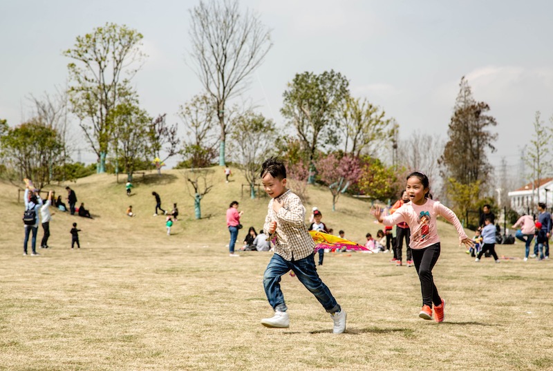 3月30日,孩子们在广富林郊野公园的草地上放风筝、追逐玩闹。