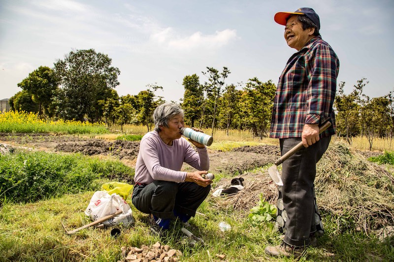 两位老人以前就住在广富林郊野公园附近,至今公园里还有一小片他们家的菜地。他们在菜地上种了小芸豆、土豆等蔬菜。