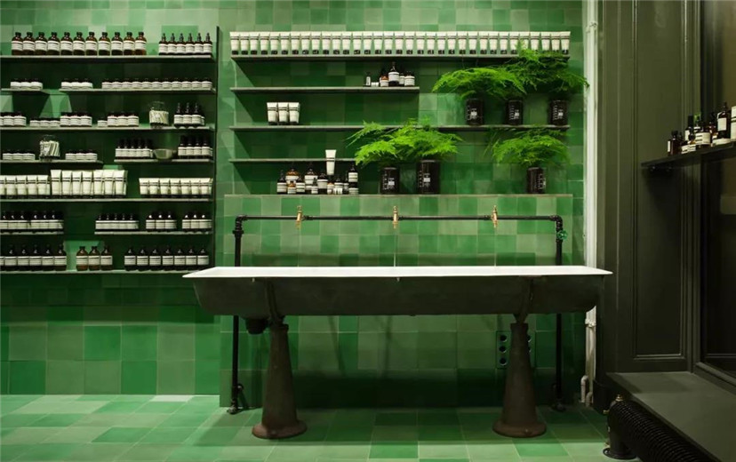 例如设计工作室Weiss-heiten为柏林Aesop Mitte所设计的店铺,这个店铺用孔雀石绿的瓷砖铺满墙面和地面,Weiss-heiten探索了柏林的独特性,它是新旧对比,粗糙与美丽,城市与自然之间的微妙关系。整个空间利用孔雀石绿打造出一方充满自然气息的绿色海洋。但是孔雀石绿具体怎么用?不妨耐心看下去。