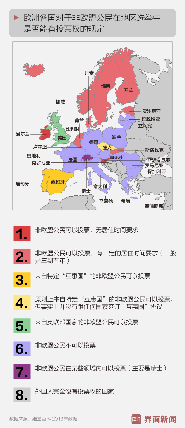 我去简单翻了翻资料:在联合国的193个成员国中,有65个国家给予了外国人某种程度上的投票权,但是细究下去便会发现有这样的问题:第一,它们大多是某个“超国家组织”(supranational organisation)的一部分,最主要的就是欧盟和英联邦;第二,它们所给予的投票权,大多数时候是基于某个组织或某种互惠关系,而并不针对全体外国人。