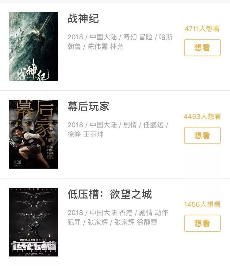 4月28日《战神纪》《幕后玩家》《低压槽:欲望之城》同期上映,徐峥主演并监制的《幕后玩家》或许是4月最受期待的国产电影,该片也是今年北影节的开幕影片。《低压槽》则由张家辉导演并主演,《战神纪》从明星卡司与奇幻题材来看更类似一部特效加粉丝电影,而从这些电影上映时间来看,它们最大的敌人或许是之后《复仇者联盟3》。