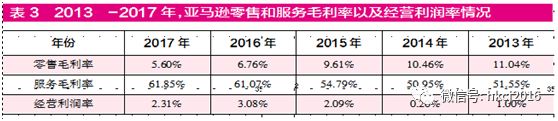 最近5年,亚马逊的零售毛利率(1-销售成本/产品净收入)自2013年的11.04%已经逐步下滑至2017年的5.60%;经营利润率(1-经营费用总和/净收入总和)更是惨不忍睹——2017年仅有2.31%,近5年最高值为3.08%。(见表3)