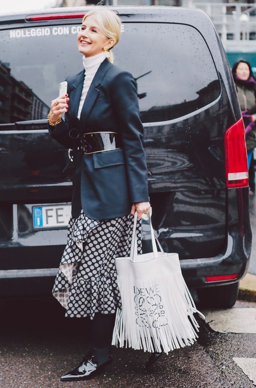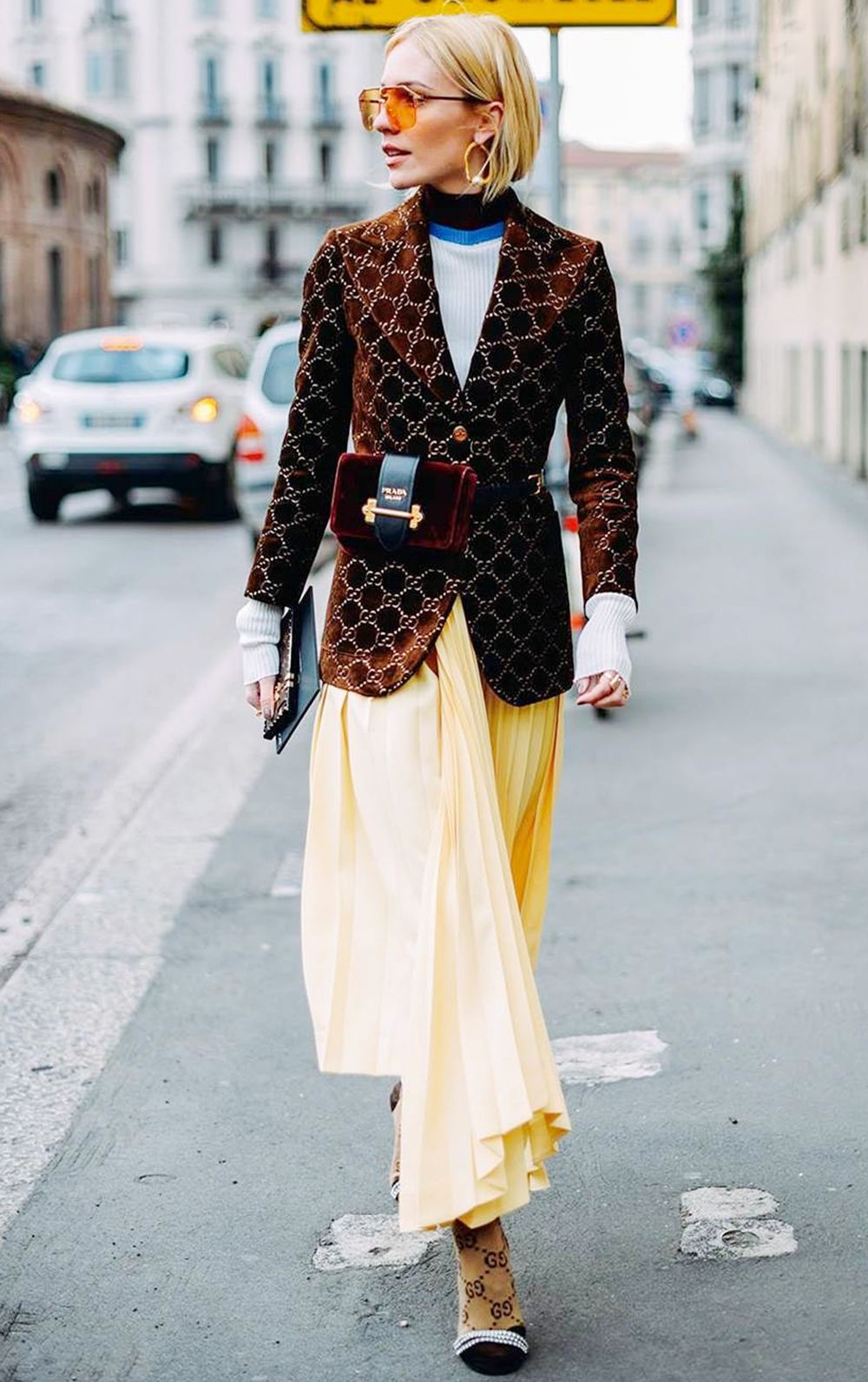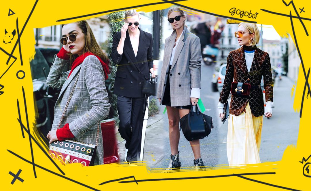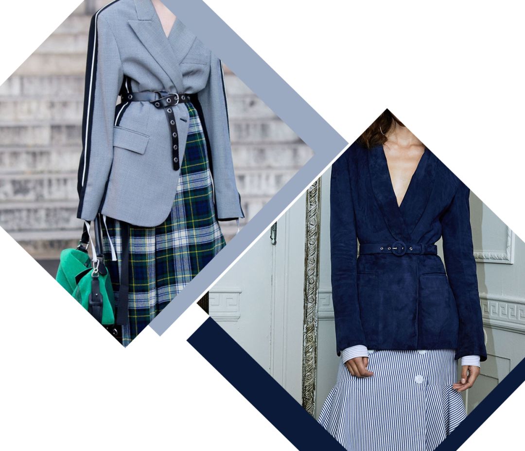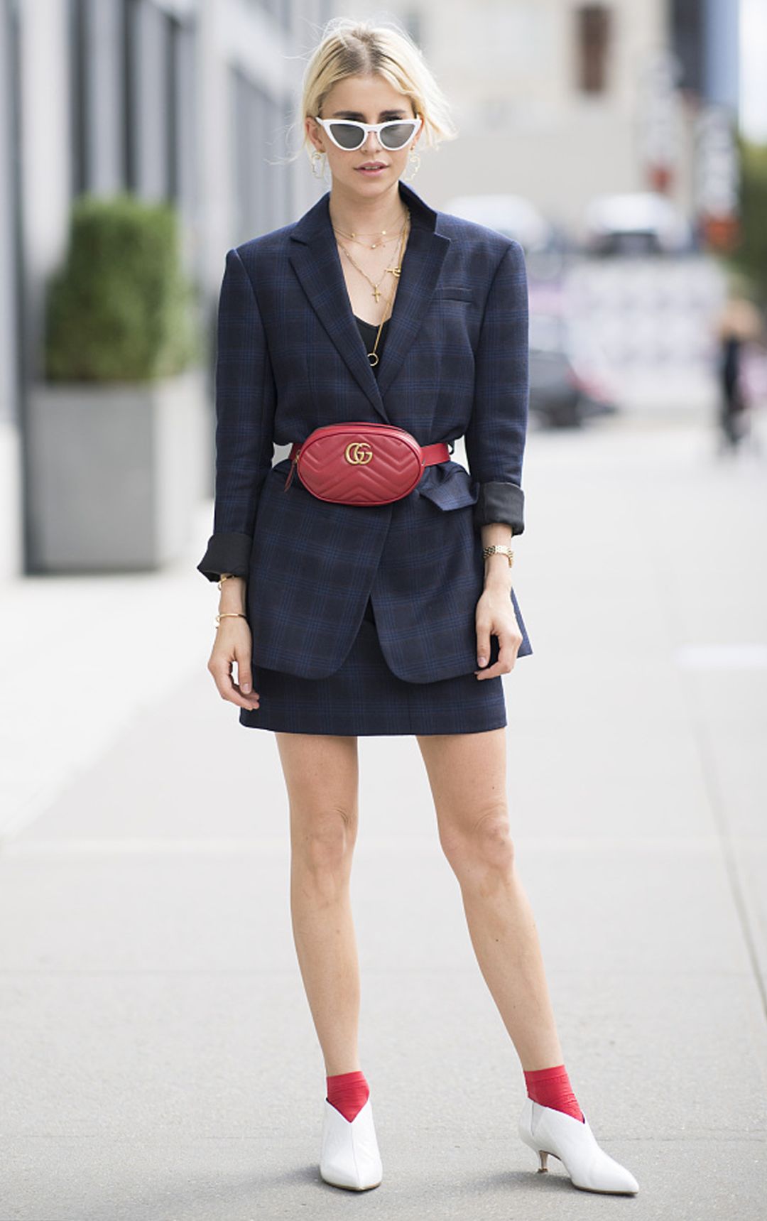 西装搭配腰包不仅可以提高腰线,显腿长,有了酷女孩的精气神。