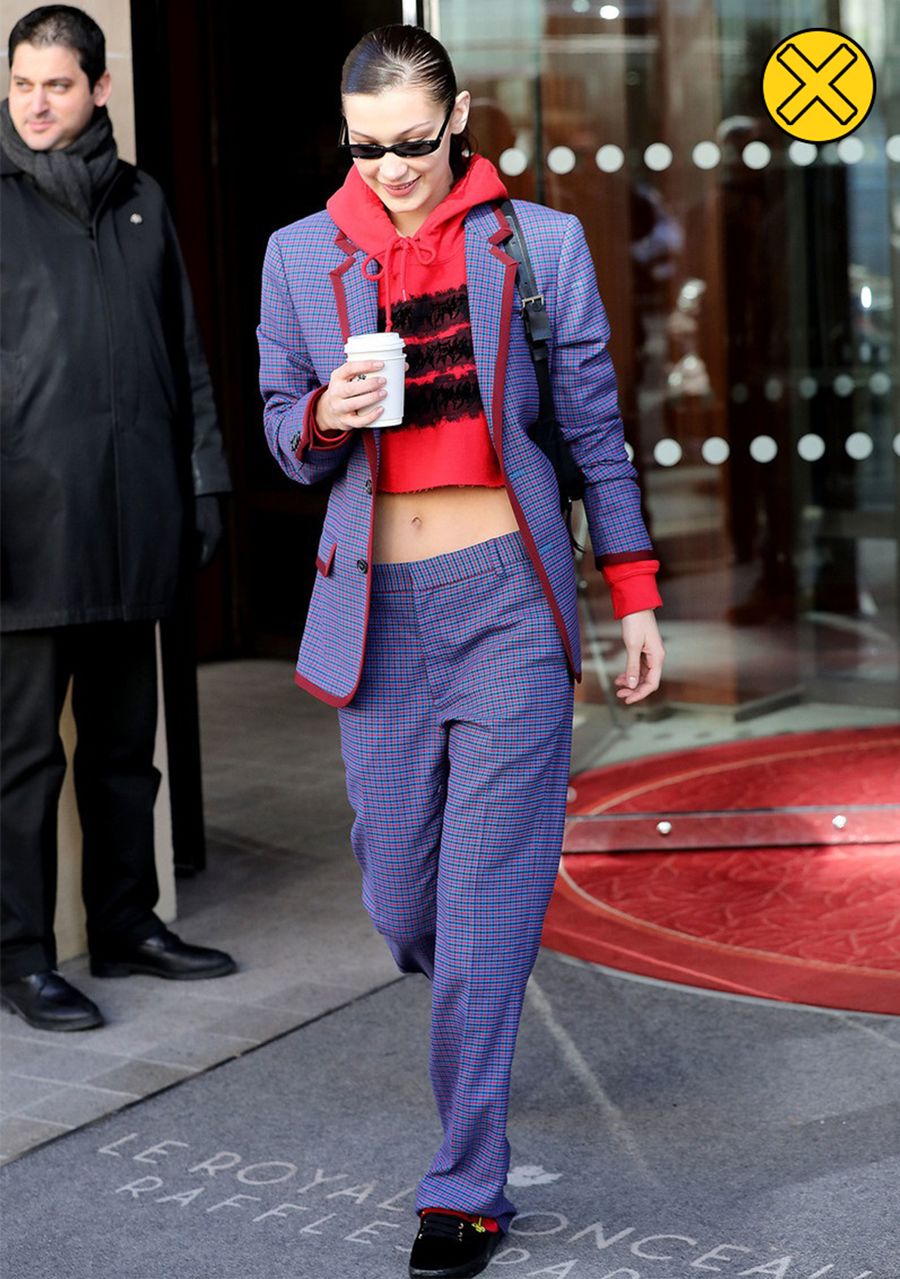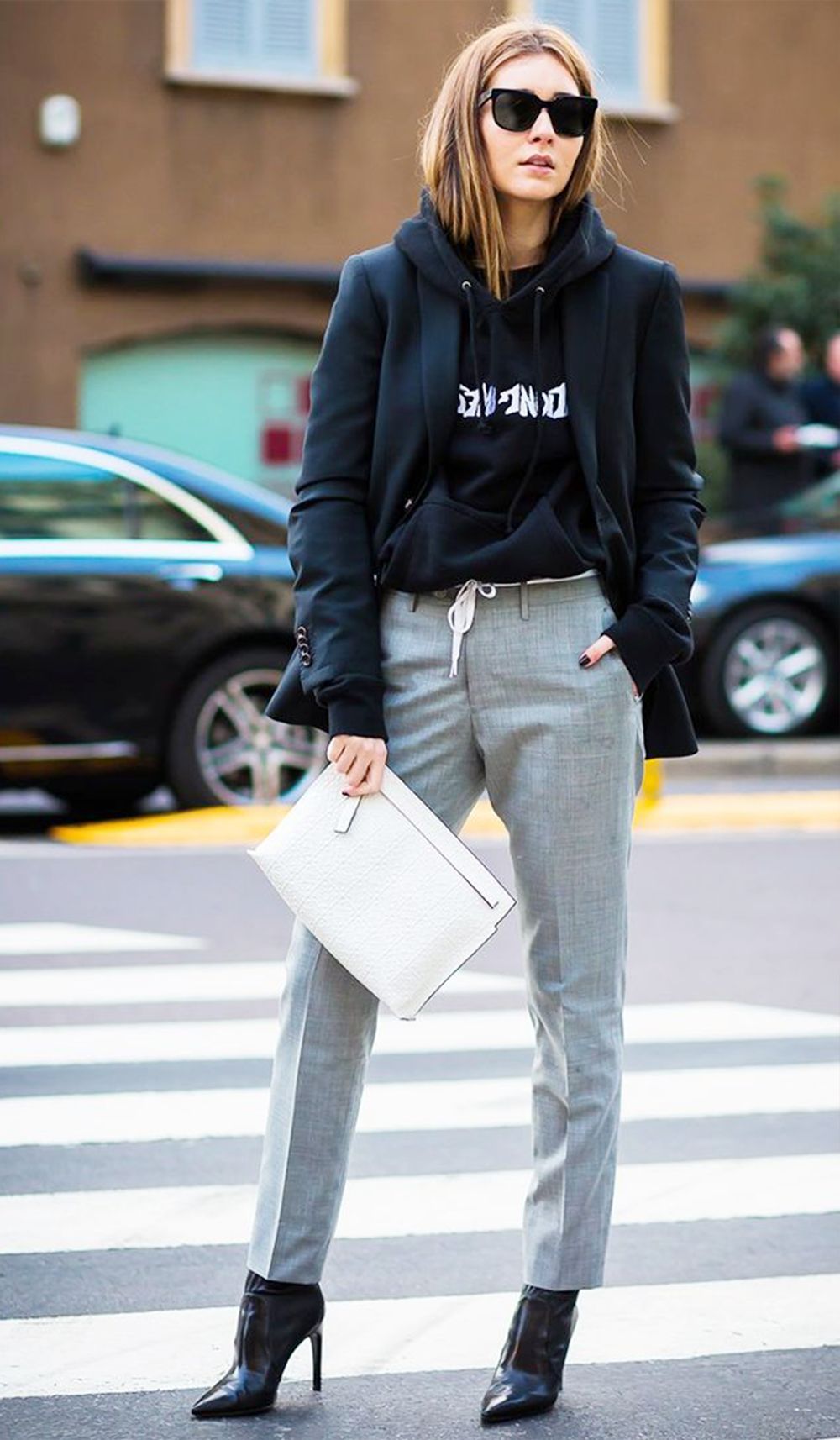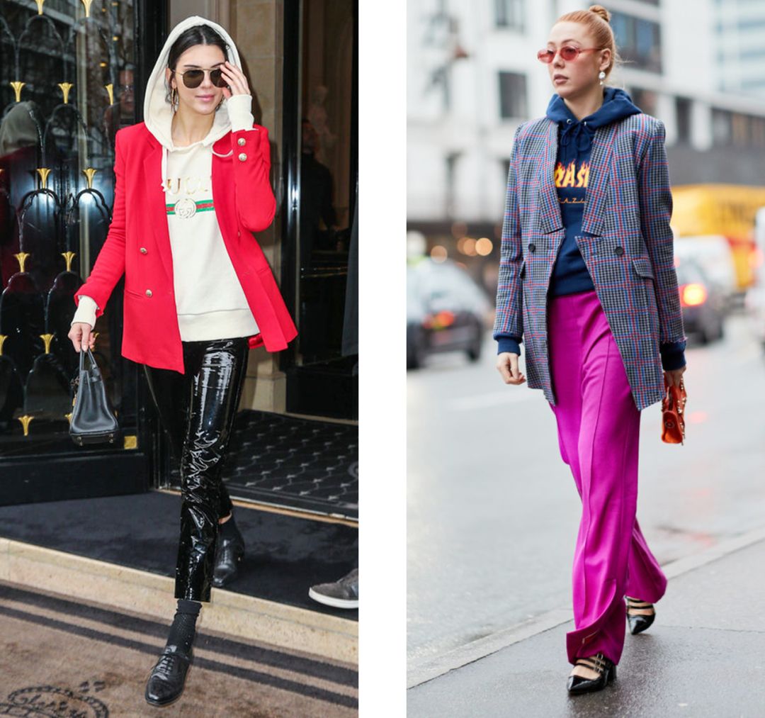 除了款式之外,颜色也要选对。可以看得出同色系的帽衫和西装搭配不够有视觉冲击,所以如果你的帽衫选了颜色比较靓丽的,那西装就可以选择比较暗的灰色款,反之亦然。