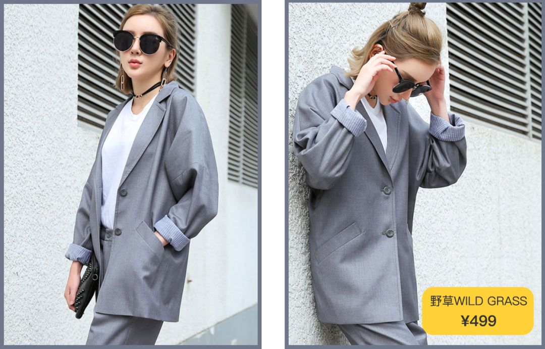 比如下面这两件灰色的宽松版型西装,和颜色比较亮的卫衣搭配在一起就很好看。