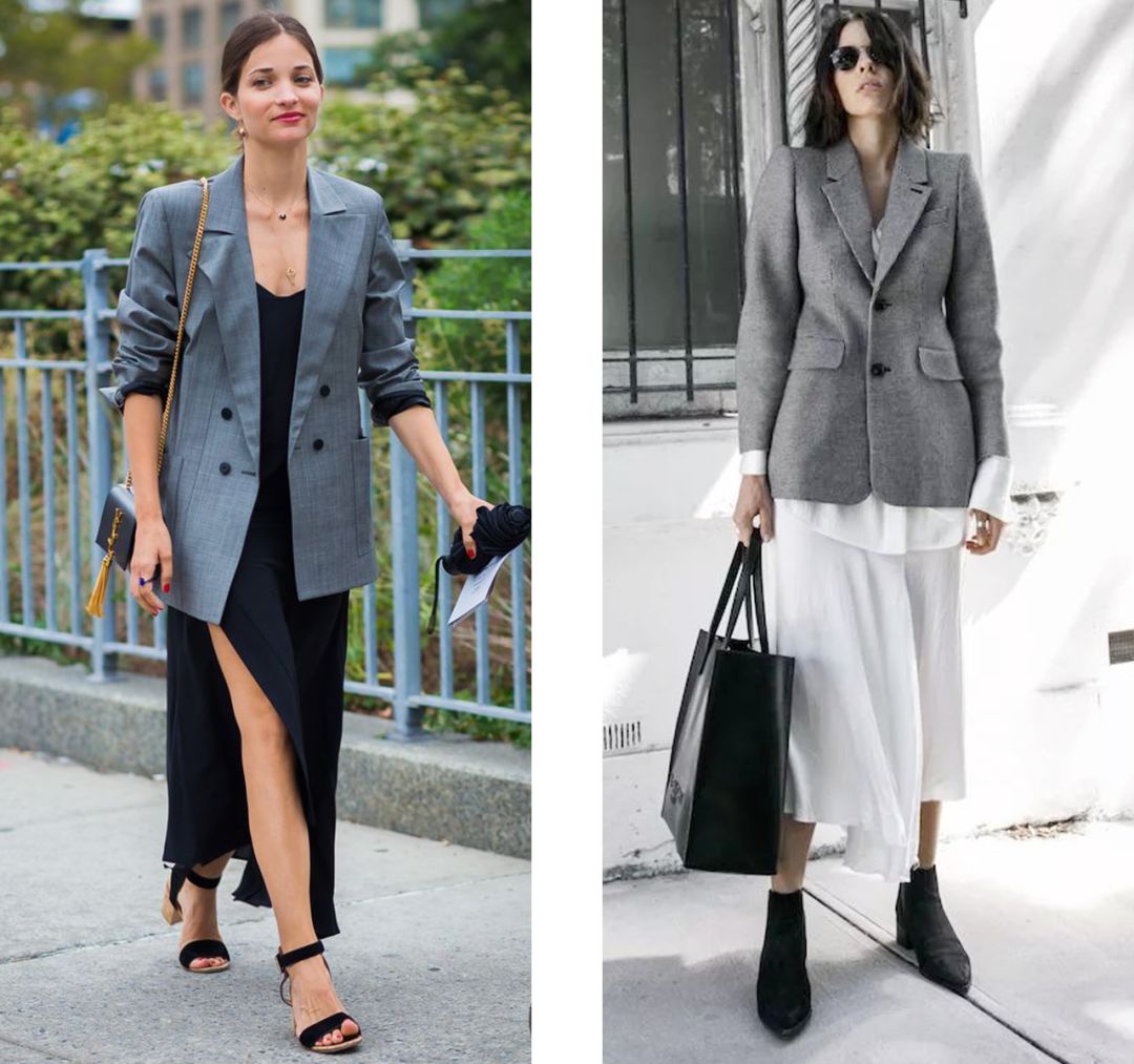 很多女孩单穿长裙不好看,单穿西装也不适合,但这两样搭在一起,娘Man平衡了,就特别好看。