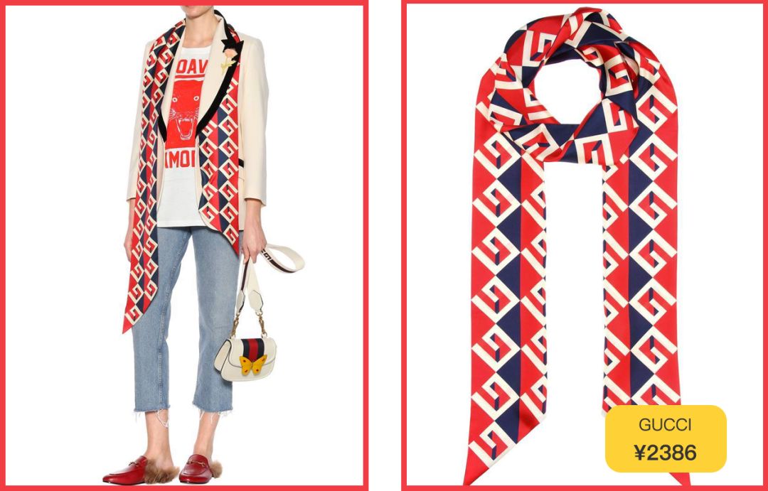 Gucci这条几何印花的长丝巾,搭配白色西装和T恤牛仔裤的组合,整体造型变得特别有层次感,也更时髦了。