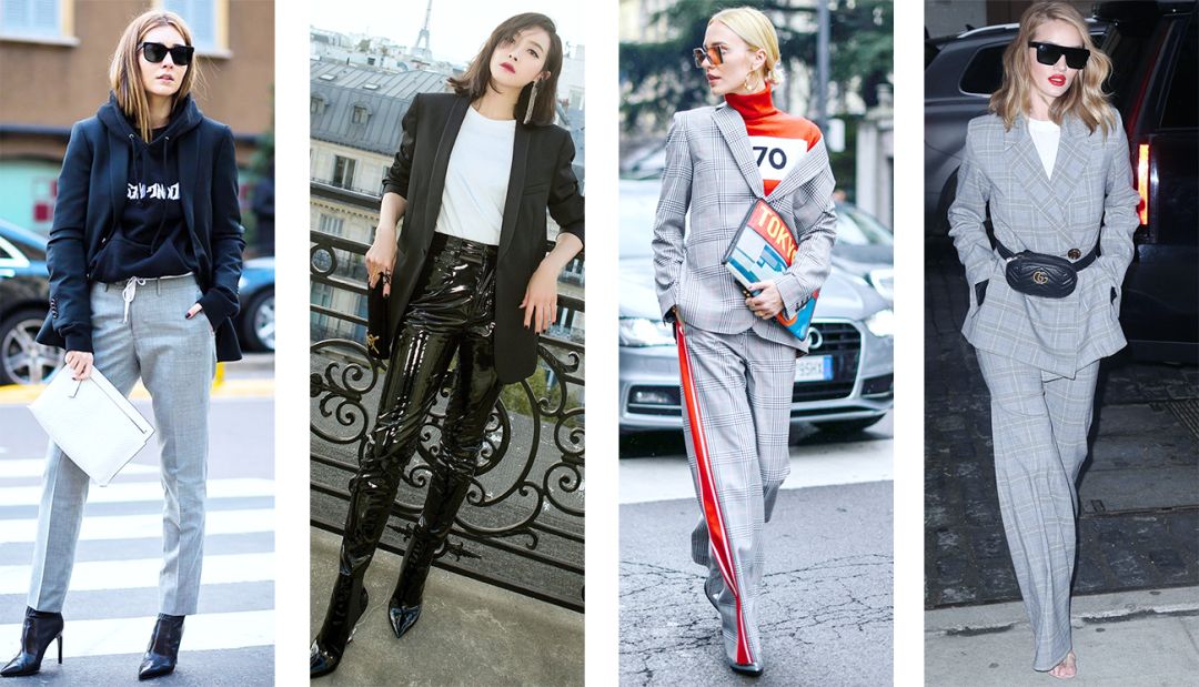 西裤一板一眼,还特别考验身材,甚少有人会在日常生活里穿。最近特别流行用竖条纹田径裤搭配西装,更随意,还不考验身高和腿型。