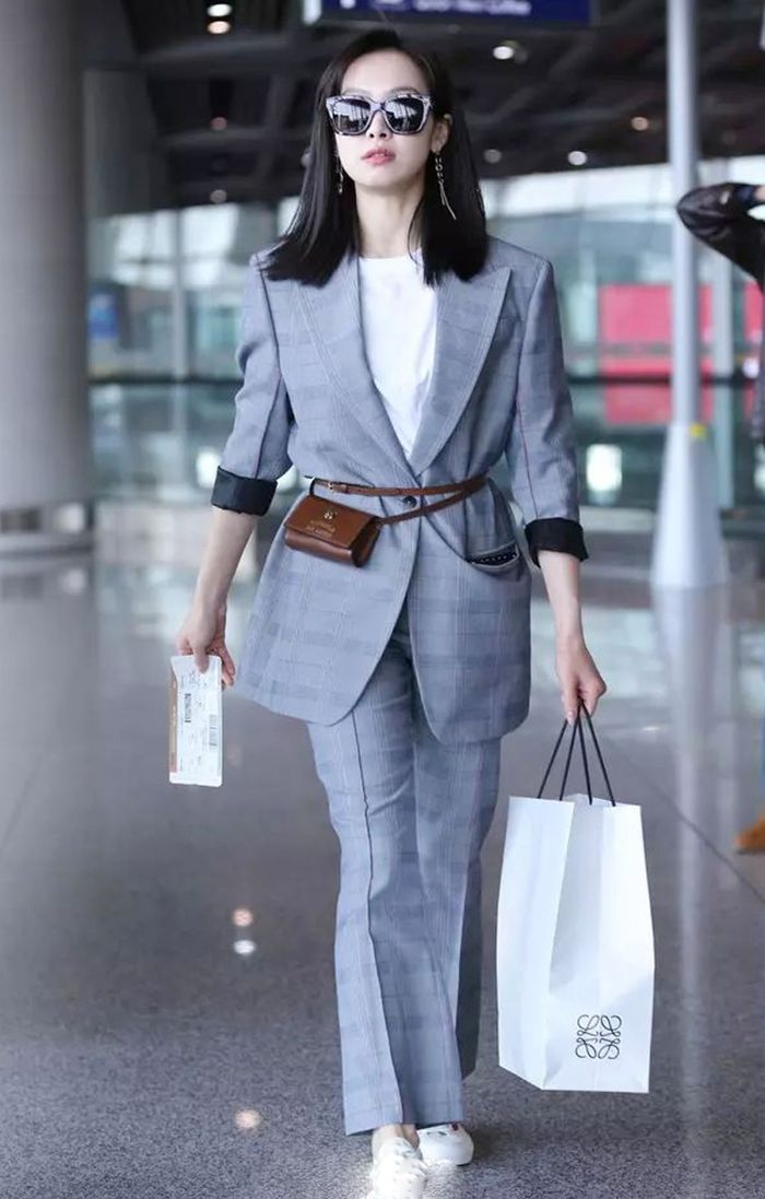 我建议系在腰上的腰包可以选极简款式,特别适合搭配宽松的西服套装,像宋茜这套就很值得借鉴,没有了腰包就像国企女干部。