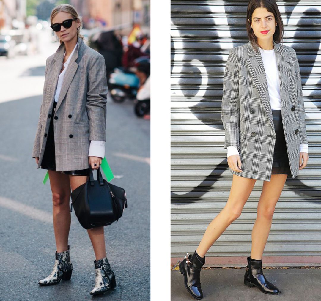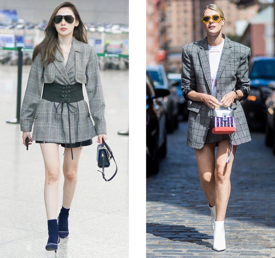 如果想让搭配更有街头感,可以用条纹或者格纹的长款西装搭配牛仔短裤。