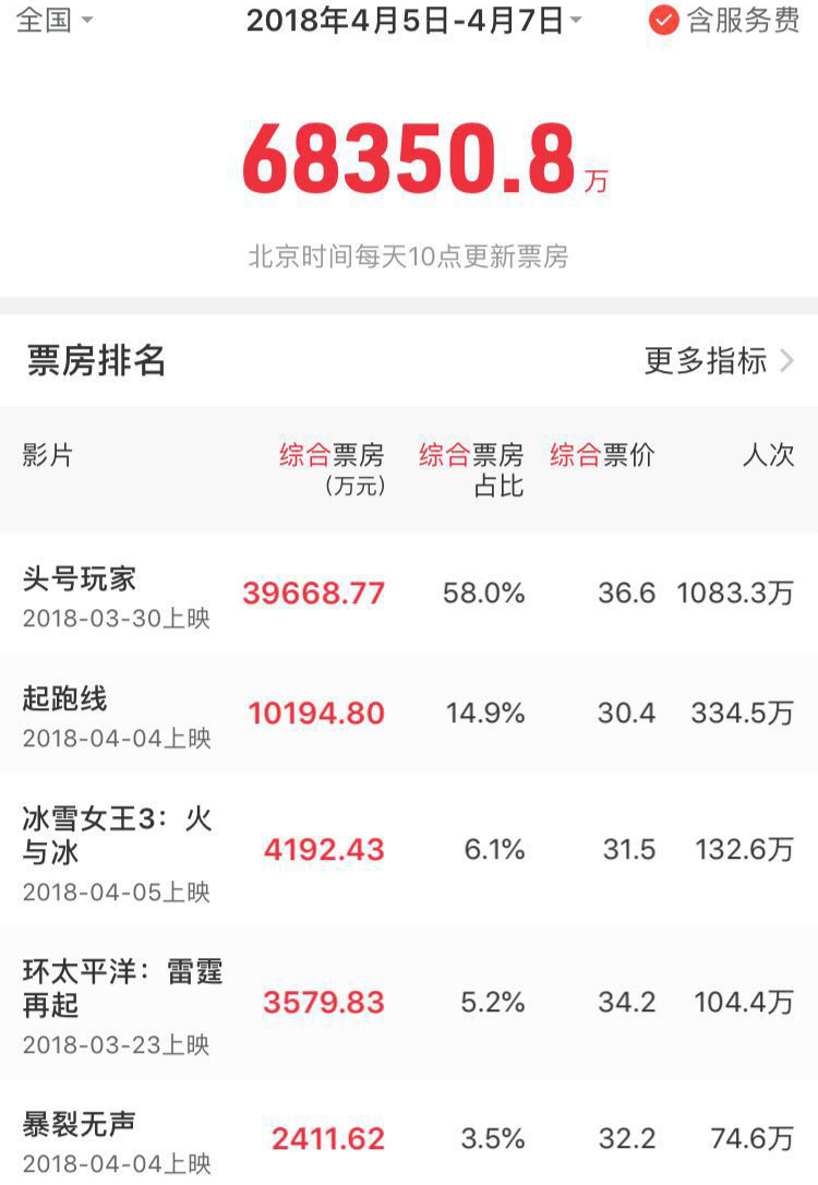 根据猫眼票房专业版统计,刚刚过去的清明档期三天假期,票房累计达6.8亿创下该档期的票房历史新高,单日总票房分别为2.78亿、2.5亿和1.58亿。其中贡献最大的当属上月末上映的《头号玩家》,它以1.63亿、1.46亿、8752万的成绩贡献了单日半数以上票房,同时其排片占比、上座率也都排在首位。按照目前的势头,《头号玩家》也将成为今年首部票房突破十亿的引进片,同时这也是斯皮尔伯格作品在内地取得最好票房成绩。