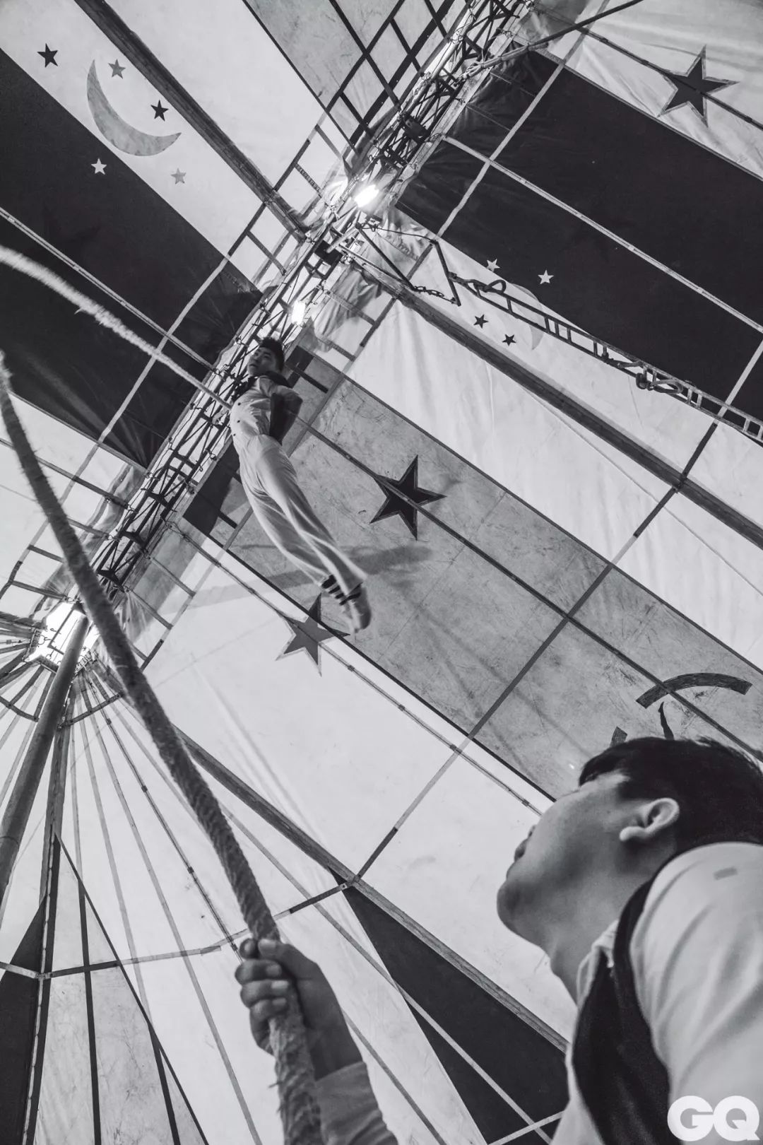 李荣庆和老虎僵持许久,主持人只好安排空中飞人解围。演员爬上高梯,在10米高空飞速旋转。音乐震得人心跳加速,观众仰起脸,大篷里红色的光让他们显得激动万分,掌声终于响起来了。