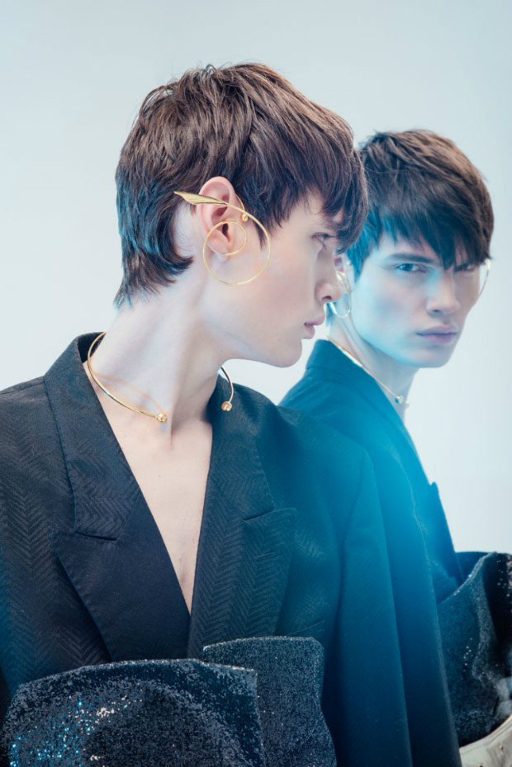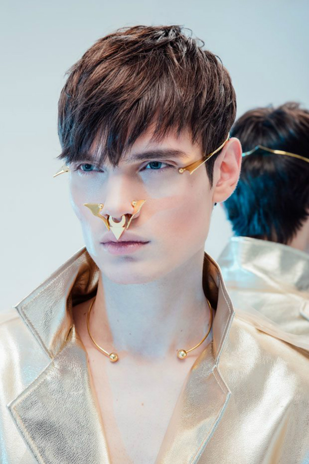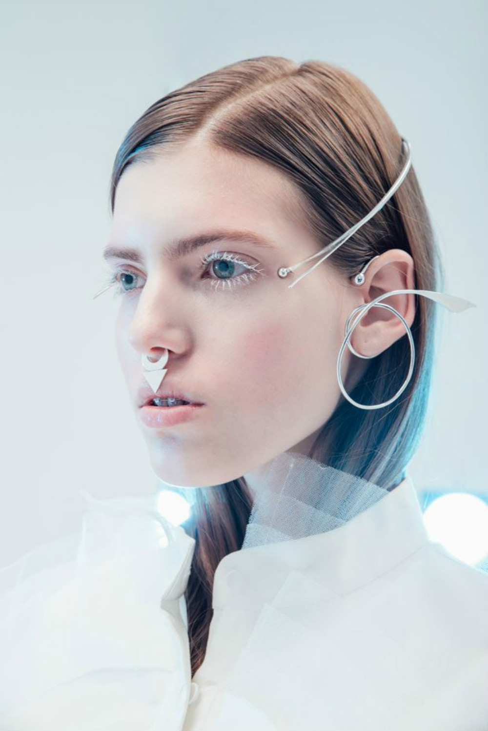 说Jean Gritsfeldt2018秋冬配饰系列有外太空“嫌疑”是有理有据的。戴两个金属球的开口项链和某种蓝牙耳机实在太像了,未来的一夸可穿戴设备长成这样也不是没可能;反着戴的时尚版“金刚箍”让人猜不出用途,但耳骨以上眼尾以下都是重要部位,它可能用于声音和视觉信号交互;像某种组织图腾的鼻环可不是简单的鼻环,否定的原因在于鼻环两边还有两只压迫鼻翼的小翅膀,戴一只配饰何必要虐待自己;螺旋状的耳饰就不必猜了,可不就是声波的形状。此外,考虑到外太空的重力条件,这个系列配饰都将缠绕附着的原理发挥到极致,可以说是很稳了。