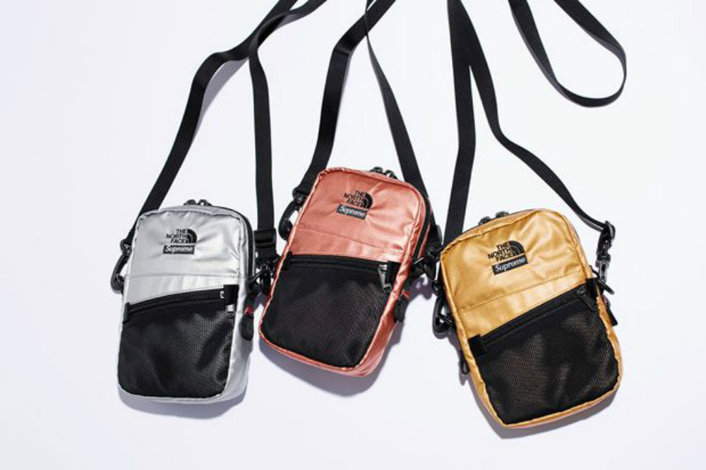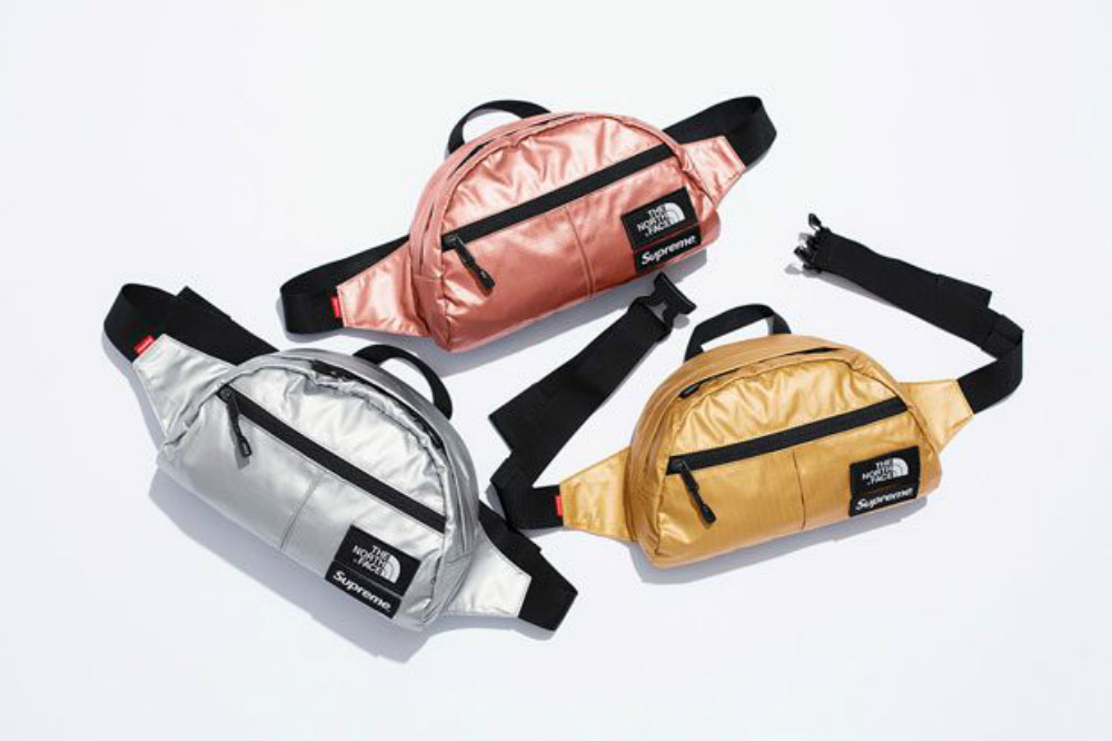 TNF的代表单品之一Mountain Parka 风雪大衣和备受群嘲的冲锋衣一样,如果不是在特殊环境下的话,它对形象的损害简直是致命的。但经由Supreme用玫瑰金、金银双色金属元素加持后,对它的态度就要换一换了;Borealis Backpack 背包行走都市的话会让人觉得像在图书馆有固定位置的朴实学霸,和潮流的距离需要用无限积分计算,而金属色的背包再加上同色棒球帽,可能就是一个神秘而乖张的地下rapper,金属色的连体工装也同理。单个看都很有趣,但如果全身来一套的话,请勇敢说出你的搭配灵感之源,《西游记》的金角大王的银角大王两兄弟没准会偷笑。