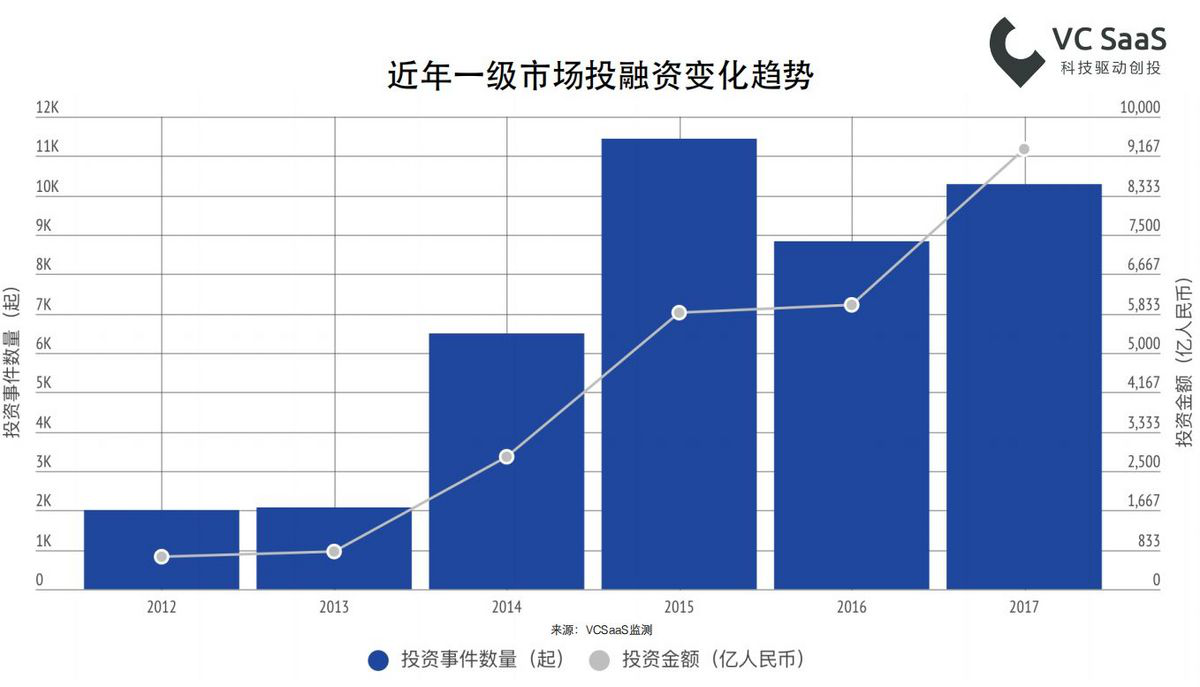 据VC SaaS数据显示,2016年虽是寒冬之年,但国内基金募资金额达到历史高峰,2017年虽有所回落,但募资金额仍接近万亿人民币。