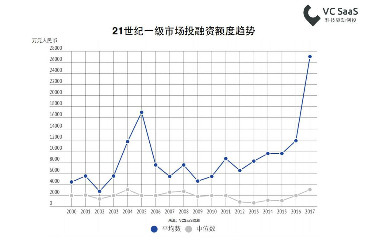 此外,2017年投融资额度平均数创造历史新高,呈现指数级上升。在去年融资事件数量没有爆发式增长的情况下,侧面反映出2017年后期投资异常火爆。