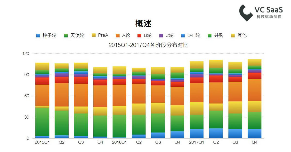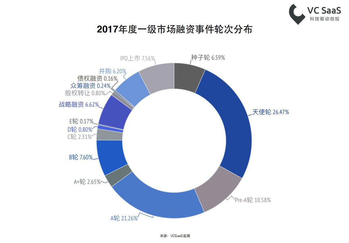 数据显示,2015年到2017年,经历了从天使轮融资事件多于A轮融资事件、到天使轮与A轮持平、再到天使轮少于A轮的过程。2017年,泛A轮融资事件占比达到34.49%,超过天使轮26.47%的占比。