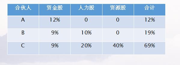 设定资金股占总股比的30%,人力股占30%,资源股占40%。这个比例要与股东沟通,案例中的比例只是参考,具体要和自己的公司实际来匹配,看是资金驱动型、资源驱动型还是人力驱动型公司,比重可以调整,股东认同就可以。