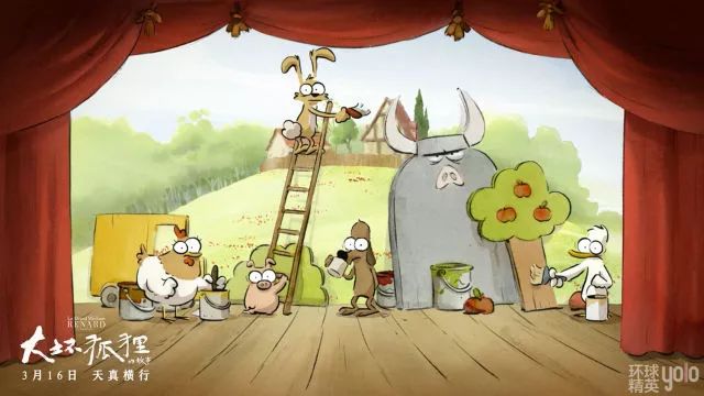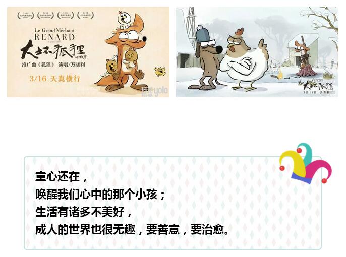 赶上“清明档”上映的动画片《大坏狐狸的故事》改编自法国同名绘本,是一部纯手绘的动画电影,描绘了在一个小农场里的一群小动物之间发生的故事。片名《大坏狐狸的故事》并不是指“发生在大坏狐狸身上的故事”,而是“由大坏狐狸讲述的故事”,因为这三个小故事中,只有一个是以大坏狐狸为主角的。温馨有爱、滑稽欢脱的法式幽默小故事,发生在一群有正义感、善良但有点儿小呆萌的小动物们身上:一只本来想吃鸡的狐狸,阴差阳错地成了小鸡的“妈妈”,三只误入歧途的小鸡一心想当“嗜血狐狸”;一头责任感爆棚的猪和它的猪队友为护送人类宝宝回家,而踏上一场惊心动魄的公路冒险之旅;一只鸭子和兔子因为“误杀”了圣诞老人,不得不扛起拯救圣诞节的世纪重任……是不是很简单的故事?有点闹腾,有点疯狂,让人啼笑皆非,却有趣无比,在繁忙过后回归到简单的童真。