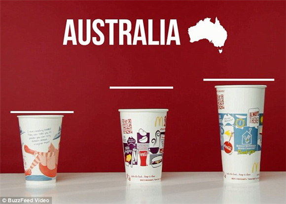 在澳大利亚,麦当劳的小杯装跟美国的相当大小,但是中杯就足足小了一截,只比其小杯大一点点。但是大杯的话就差不多一样了。