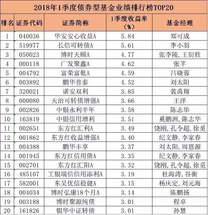 一季度债基收益排名榜前20显示,所有产品收益;率均在3%以上,其中6只收益率超过4%。