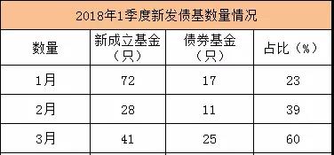 从新基金发行成立情况看,债券基金正在受到市场关注。根据数据,今年一季度市场上共有141只新基金成立,其中债券型基金的数量占比持续攀升。刚刚过去的3月,债券型基金发行份额达425.79亿,占全市场发行规模的57.71%。