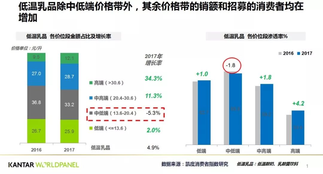 整体看来,酸奶,尤其低温酸奶是属于较为成熟的品类,高端化趋势是一直在呈现的,根据凯度消费者指数研究的数据显示:随着近年来经济的快速发展,高端产品的市场份额已经占到12%,渗透率也达到33.6%,比2016年增长了4.2%。高端产品在高收入年轻家庭尤为接受度高。