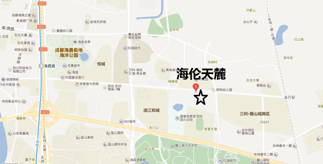 海伦天麓项目位于海昌南路东延线旁,西侧为红星路南延线,与项目的直线距离约700余米,南侧为麓山大道,与项目的直线距离约500余米,东侧为三利麓山城项目,隶属于天府新区麓山板块。