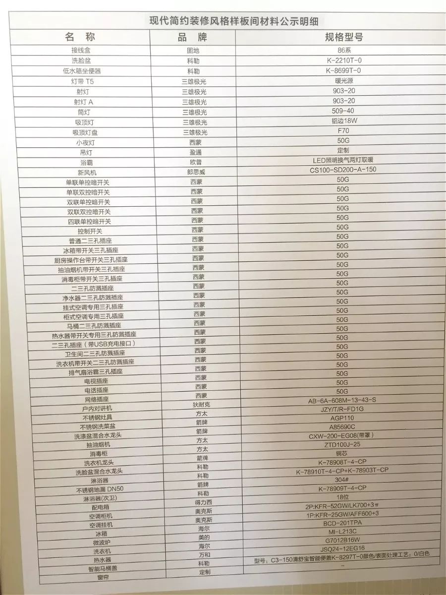 项目将采用精装交付,精装标准为3298元/平方米,具体配置如图所示,除基本的天地墙、厨卫等配置外,还包含品牌的空调柜机、挂机,以及冰箱、微波炉和洗衣机。