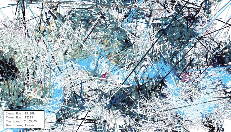 这个叫做粒子群地图(Particle Swarm Maps),是一个结合了数字制图(digital cartography)和参与式地图(participatory mapping )、利用社交媒体数据再现公共空间的抽象动画地图。