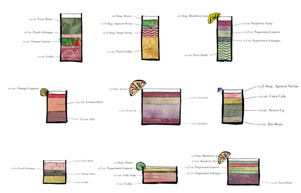这幅图是一个叫MACHINE MIXOLOGY的互动艺术装置,在德国柏林的ACUD MACHT NEU展出。参观者可以要求一个基于高斯混合模型的计算机调酒师自动生成鸡尾酒配方,然后用可视化的方式呈现。