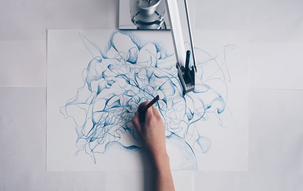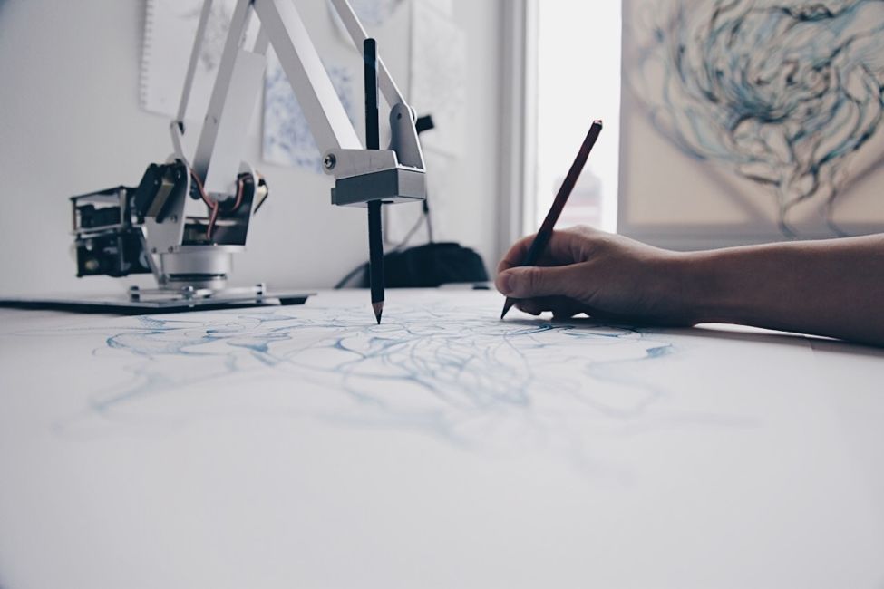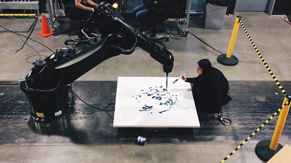 而在华裔艺术家Sougwen Chung (愫君)的身边也有着这样一个机器人。当Sougwen每次提起马克笔在白色纸张上作图时,这台机器人就会和她一起在同一块画板上进行绘画二重奏。