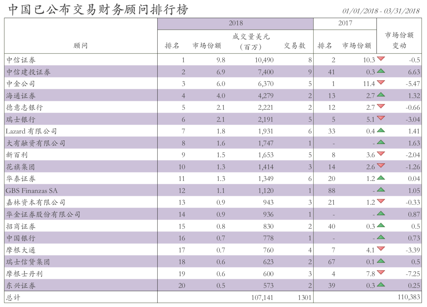 彭博还公布了2018年第一季度兼并收购交易的财务顾问排行榜。其中,中信证券表现亮眼,以104.9亿美元(约660亿元人民币)的兼并收购交易总额问鼎第一。除此之外中信建投、中金公司和海通证券也跻身2018年第一季度榜单的前五。