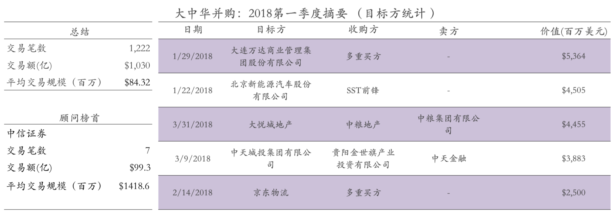 近日,彭博(Bloomberg)发布了2018年第一季度大中华区兼并收购排行榜。