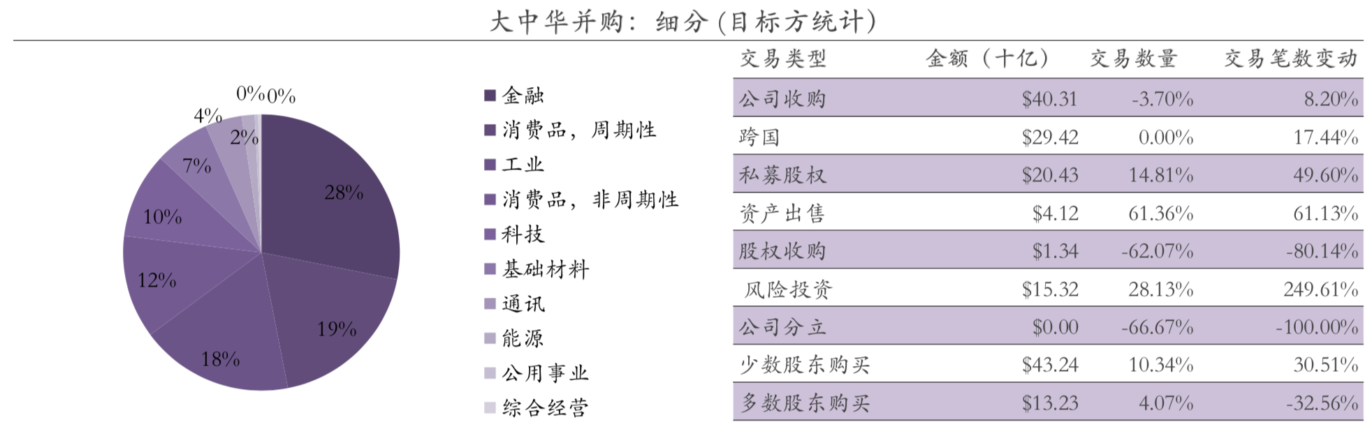 在一季度整个大中华地区的并购活动中,金融和周期性消费品行业占了近半壁江山,分别录得28%和19%的份额,工业和非周期性消费品紧随其后,分别占18%和12%。从交易类型上看,资产出售方式增长强劲,交易数量激增6成,而公司分立和股权收购方式的交易数量则分别减少66.67%和62.07%。