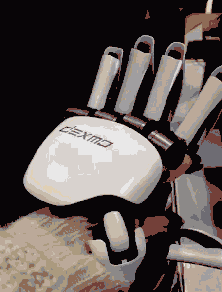 这款数据手套外形看起来就像酷炫的机械手,可以提供“instant force feedback” (即时力反馈),根据虚拟物品的形状以及软硬不同,使得每个手指都能感到不同程度的触发力。