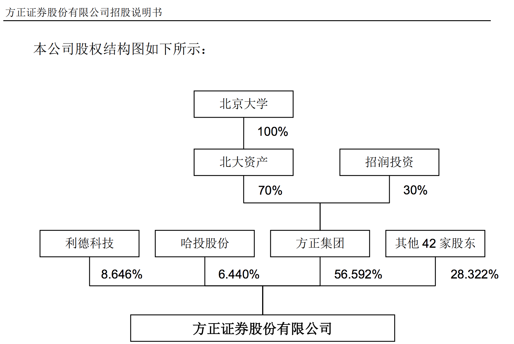 界面新闻记者查阅方正证券上市时的招股说明书发现,文件中表明“本次发行前,本公司各股东之间不存在关联关系”。在公司股权结构的披露中,共有45个股东,利德科技、西藏昭融(时名上海圆融担保租赁有限公司)、西藏容大(时名上海容大贸易发展有限公司)也出现在股东名单中。但未有披露上述三个公司与方正集团的关联关系。方正证券上市保荐机构为平安证券,主承销商为平安证券和中信证券。