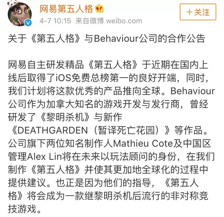 抄袭引热议后,《第五人格》官博随即也发表了声明。声明中并没未提及版权问题,只是称《黎明杀机》的制作方Behaviour公司两位制作人将以顾问身份为《第五人格》全球化提供指导。