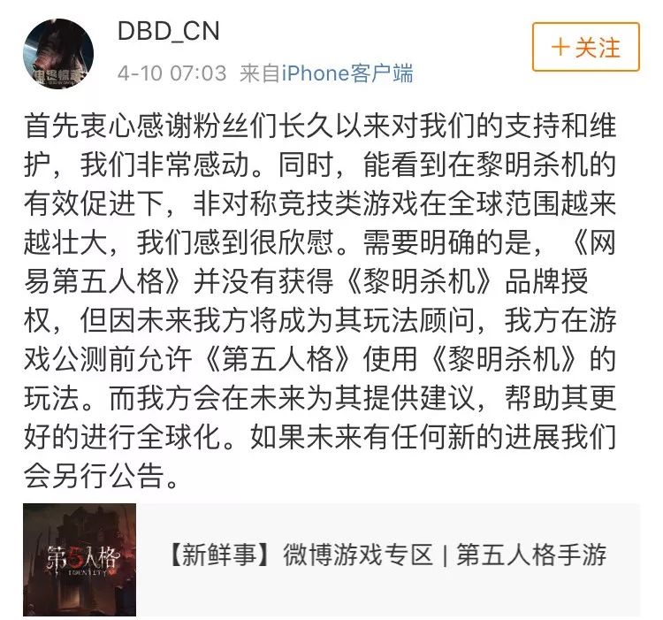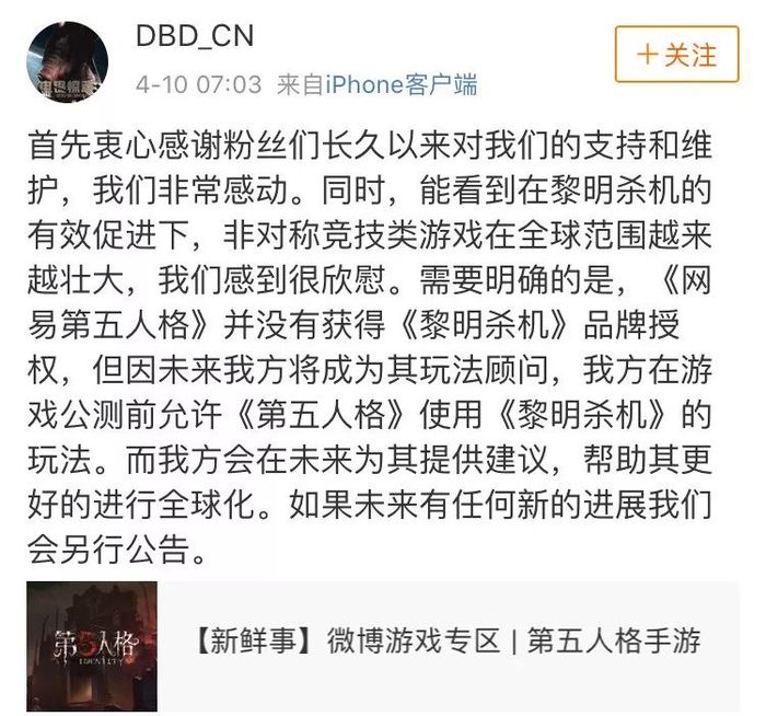 而在今日,《黎明杀机》中国地区官博@DBD_CN也做出了回应。回应中肯定了网易“玩法顾问”的说法,但明确指出了《第五人格》并未获得《黎明杀机》的品牌授权。值得注意的是,DBD_CN在声明中指出“我方在手游公测前允许《第五人格》使用《黎明杀机》的玩法”。