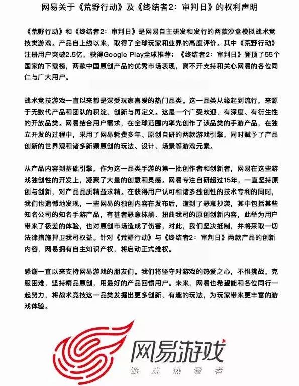 而网易对此的回应是自己拥有《终结者2》和《荒野行动》的自主知识产权,将启动正式维权。而在声明中,网易称这两款游戏采用的都是自研的引擎,但在世界观上,网易对自己的定位是创新,并称自己赋予了该游戏更多新颖原创的玩法、设计、场景等游戏元素。