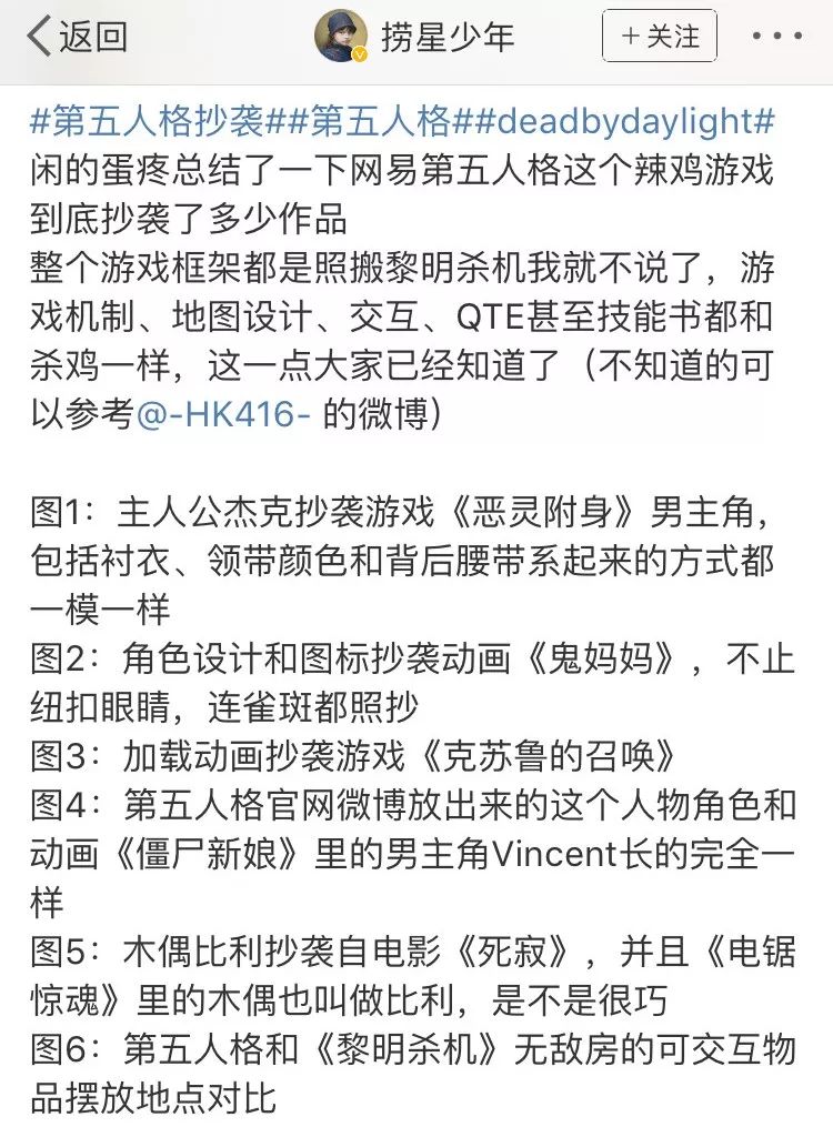 热度刚起,《第五人格》就被扒出了抄袭《黎明杀机》。据微博用户@捞星少年整理,《第五人格》不仅在游戏框架上照搬《黎明杀机》,游戏机制、地图设计、交互、OTE甚至技能书都和杀鸡一样。此外,该网友还指出《第五人格》在美术和动画上涉嫌抄袭《恶灵附身》《鬼妈妈》《克苏鲁的召唤》《僵尸新娘》《死寂》等多部作品。