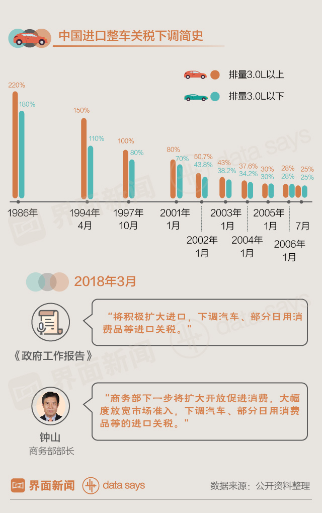 据界面新闻记者统计,在过去三十年间,中国进口车关税已经历9轮下调,从最初的100%-200%降至目前的25%。在2006年7月第九次下调后,中国进口车关税已经12年未变。