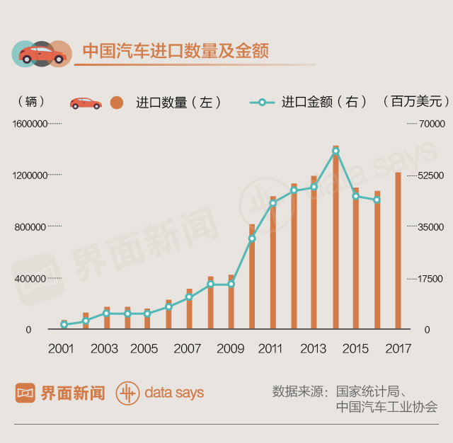 本世纪以来,除2015、2016年略有下降外,中国进口车数量和金额基本保持稳步增长。2017年,中国进口车数量达到121.6万辆。