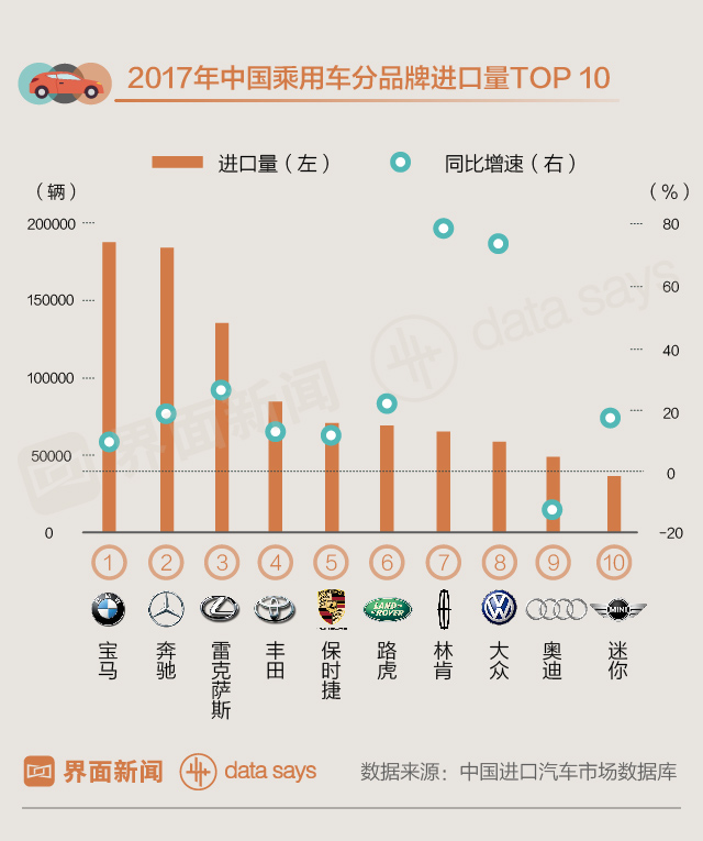 分品牌来看,宝马和奔驰依然是最受中国人欢迎的进口车品牌,2017年进口量均超过18万辆。在排名前十的进口车品牌中,林肯和大众的增速最快,均超过70%,年进口量在6万辆左右。