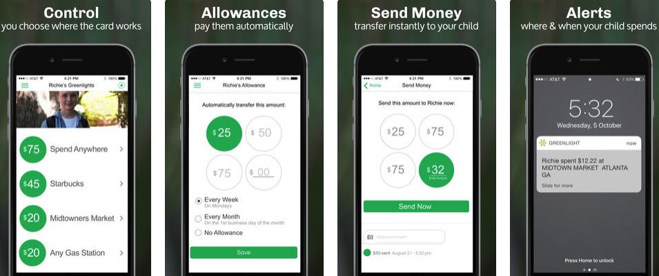 同名应用软件与 Greenlight 卡片配套使用,支持安卓和苹果系统,提供双亲和子女两个版本