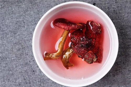 真的红菇,入水后水会变红色,这是因为红菇中含有丰富的红菇素。红菇浸泡也会褪色,但颜色散开时不会呈均匀状,且水颜色变化缓慢,水颜色清透。(闻起来清香,而染色的假品则略有刺激性气味)