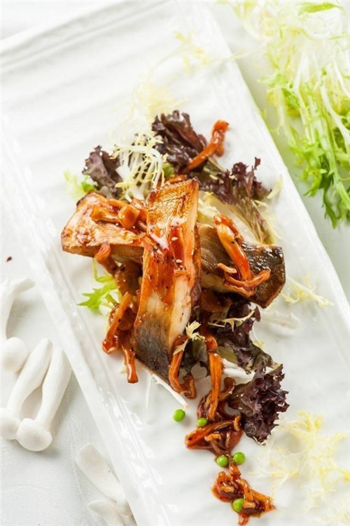此菜中用到的菌菇以调味酱的形式出现,鲳鱼肉质新鲜滑嫩,以红菇酱与调料生腌入味,直接烤制,不仅不失其美味,还增添了菌香的味道,再佐以党参,健脾益气。