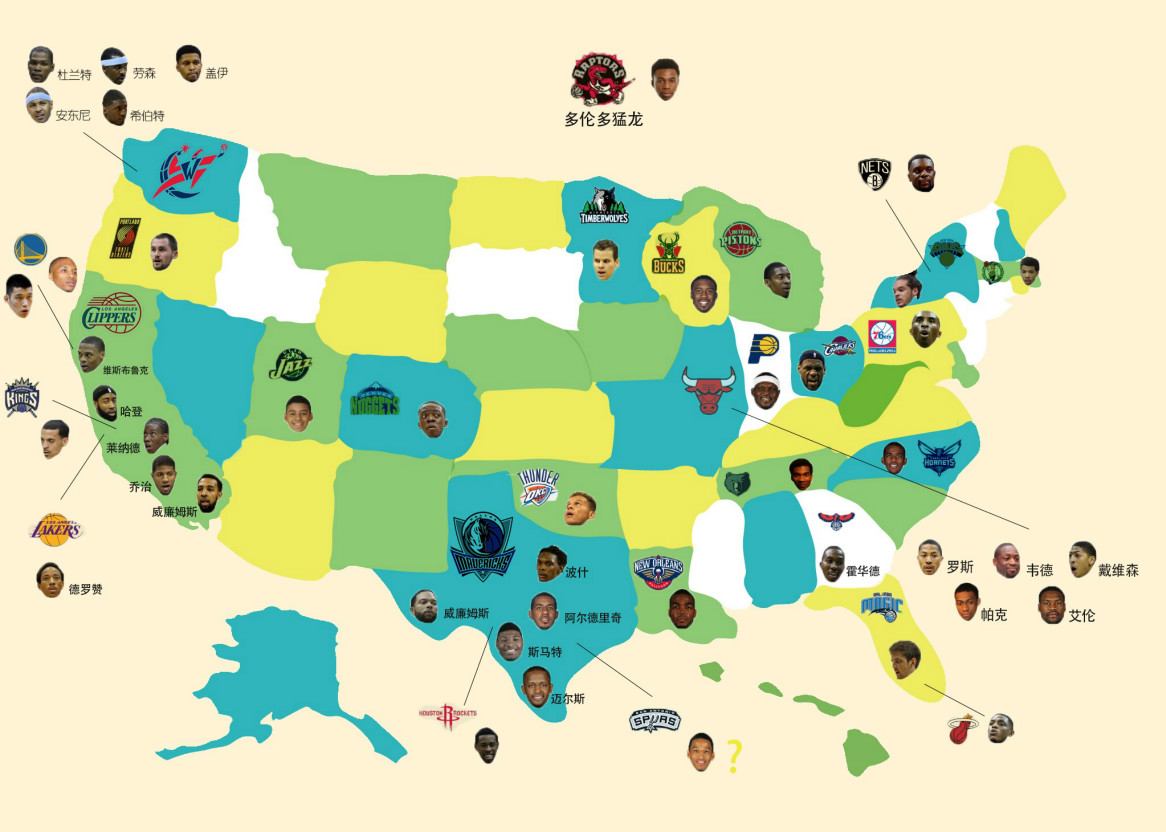 在我们给球员们归类时,原则上球队所在地到家乡距离在两个小时的车程已是最大极限。当然,面对诸如圣安东尼奥马刺这样的小市场球队时,我们又很大方,纵然如此,按照家乡分配,卫冕冠军依然凑不齐一个首发阵容,也许这才是他们打造国际纵队的根源?